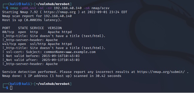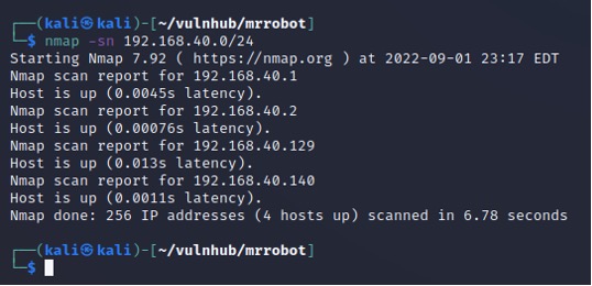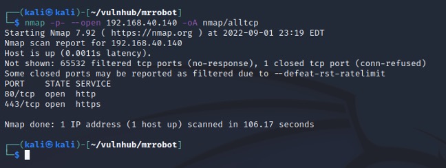 With the scan we can see that the Mr. Robot machine got assigned the IP address 192.168.40.140. Now we can do a full port scan with nmap to see what ports are open.