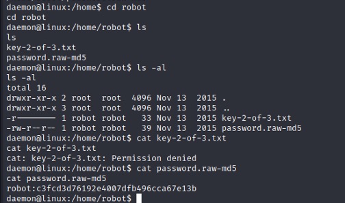Checking in the /home/ directory, we find the robot user’s directory. There is the second key, but our user daemon doesn’t have permission to read it. There is another file named password.raw-md5, so let’s check it out.