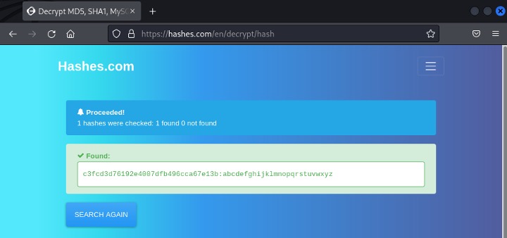 Looks like we have the md5 hash of robot’s password. Running the hash through my preferred online hash cracker, hashes.com, it comes back with the password of abcdefghijklmnopqrstuvwxyz.