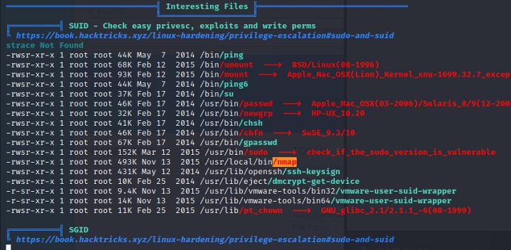 Running linpeas to easily enumerate the system, I notice orange highlighted text scroll by showing that nmap has the suid bit set. This could be the ticket to root! Nmap versions 2.02 to 5.21 included an interactive mode that we may be able to use to escalate our privileges.