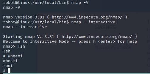 Accessing the shell through nmap’s interactive mode we can see we are now in as root!