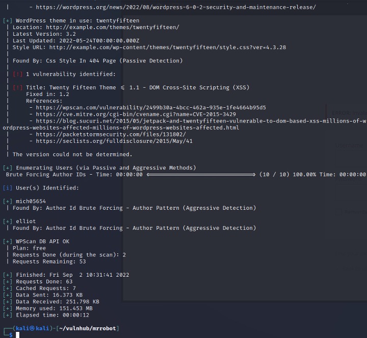 WPScan identified two users: mich05654 and elliot. I wonder if we can brute force the WordPress login using the wordlist that we found earlier.
