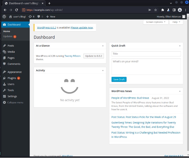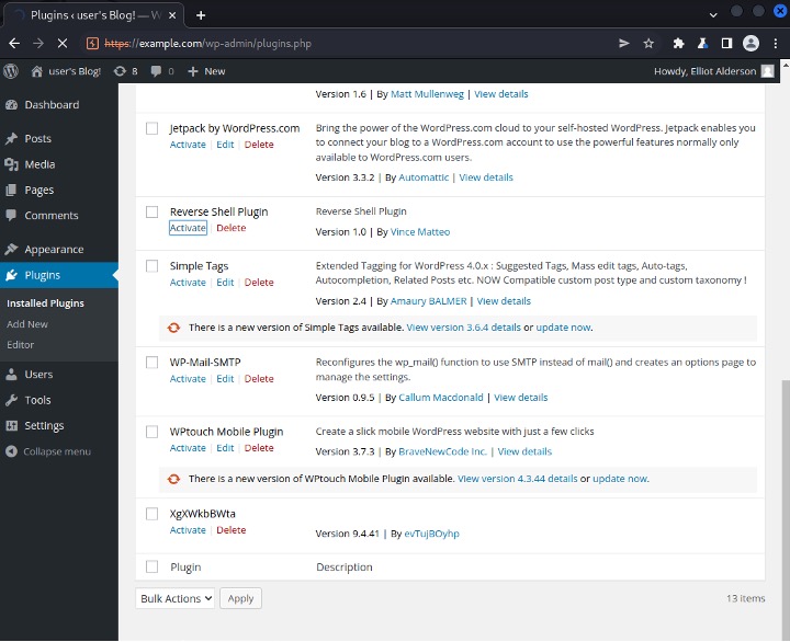 We’re in! elliot is the admin for the WordPress installation. When we have admin access to WordPress, one of the main things we do is install and activate a reverse shell plugin. I used the simple reverse shell plugin found on the seven layers website (https://sevenlayers.com/index.php/179-wordpress-plugin-reverse-shell).